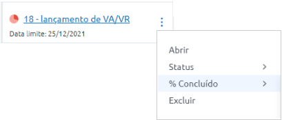 % Concluído - Ao selecionar essa função, serão listados os possíveis percentuais variando de 0 à 100, de 10 em 10%. Esse campo é alterada manualmente pelo usuário.