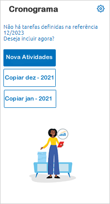 Ao acessar o Painel de Conferência da empresa logada e não possuir tarefa cadastrada no cronograma, será apresentada a seguinte informação: Não há tarefas definidas no mês de xxxx. Deseja incluir agora?. O sistema irá possibilitar criar atividades a partir das seguintes opções: Nova atividade, Copiar da referência anterior a referencia atual ou Copiar da referência igual a referência atual, mas do ano anterior.