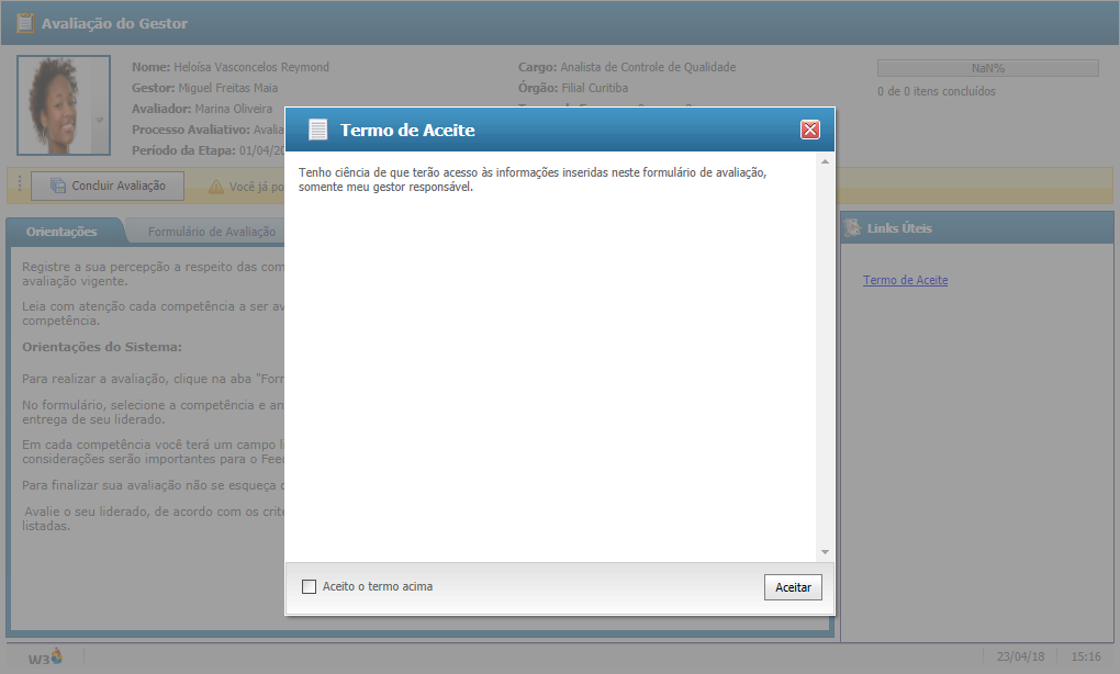 Caso deseje que o colaborador acesse o formulário de avaliação somente após leitura/concordância de um termo de aceite, marque a opção Ciclo possui termo de aceite e utilize a caixa de texto exibida na guia Design para inserir o termo que será exibido ao usuário. Caso deseje verificar como será apresentado o termo, basta acessar a guia Pré-visualização.