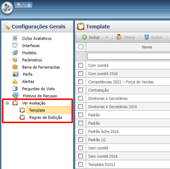 No Gen.te Desenvolve – Competências acesse a tela Configurações Gerais, no menu Ver Avaliação, e visualizará as configurações de Template e Regras de Exibição.