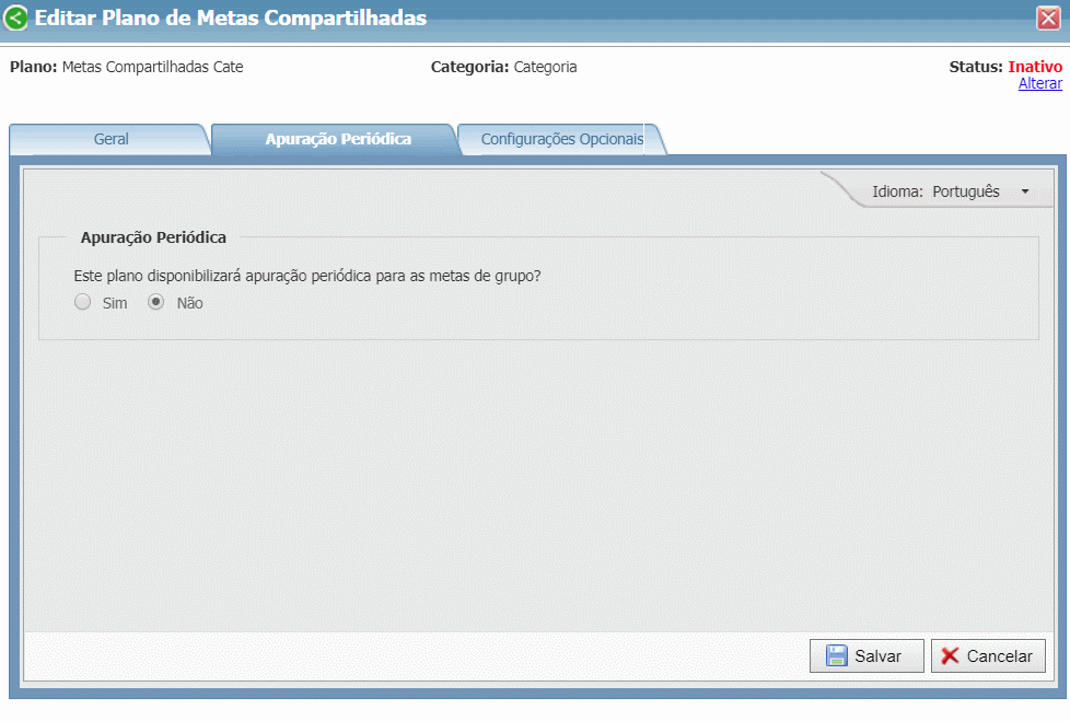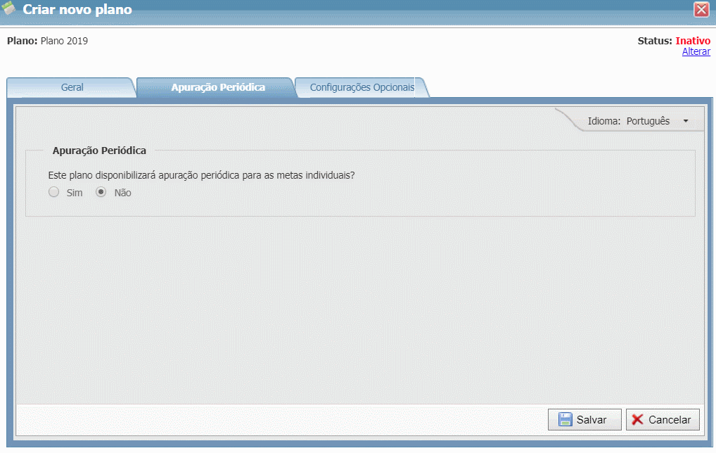 Na guia Apuração Periódica, informe se o plano de metas à ser criado irá permitir a realização da apuração periódica.