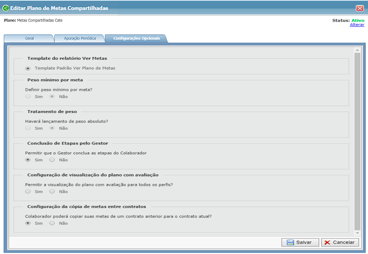 Na guia Configurações Opcionais, informe o template a ser visualizado no relatório Ver Metas, defina se as metas irão ter um peso mínimo, escolha se haverá lançamento de peso absoluto e se será permitido a utilização de Corresponsável pelo responsável de grupo.