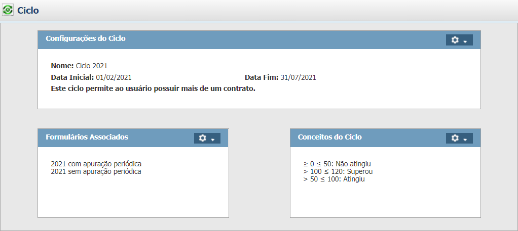 Selecionando o Ciclo, será exibido um resumo de seu cadastro como um todo, apresentando suas Configurações, Formulários Associados e seu Conceito caso o possua.
