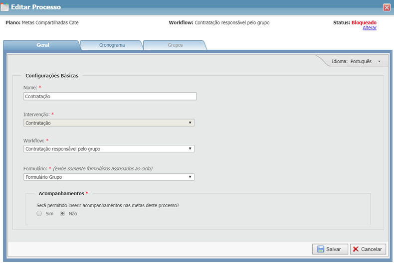 Acesse a guia Geral, informe o Nome do processo de contratação, selecione o Workflow, selecione o formulário e indique se será permitido a inserção de Acompanhamentos nas metas deste processo.
