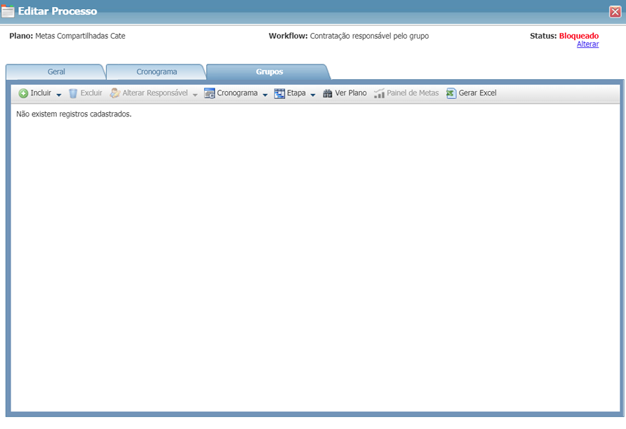 Na guia Colaboradores, os participantes dos processos podem ser incluídos, excluídos, realizar alteração de responsável e alterações no cronograma individual dos colaboradores, liberar etapas, indicar o nome do responsável à realização dos processos, gerar excel, visualizar o painel de metas e o plano.
