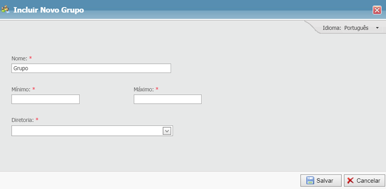 Defina o nome do grupo, o número mínimo e máximo de metas e selecione um ou mais órgãos para compor o grupo.