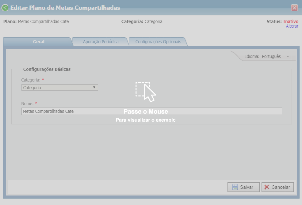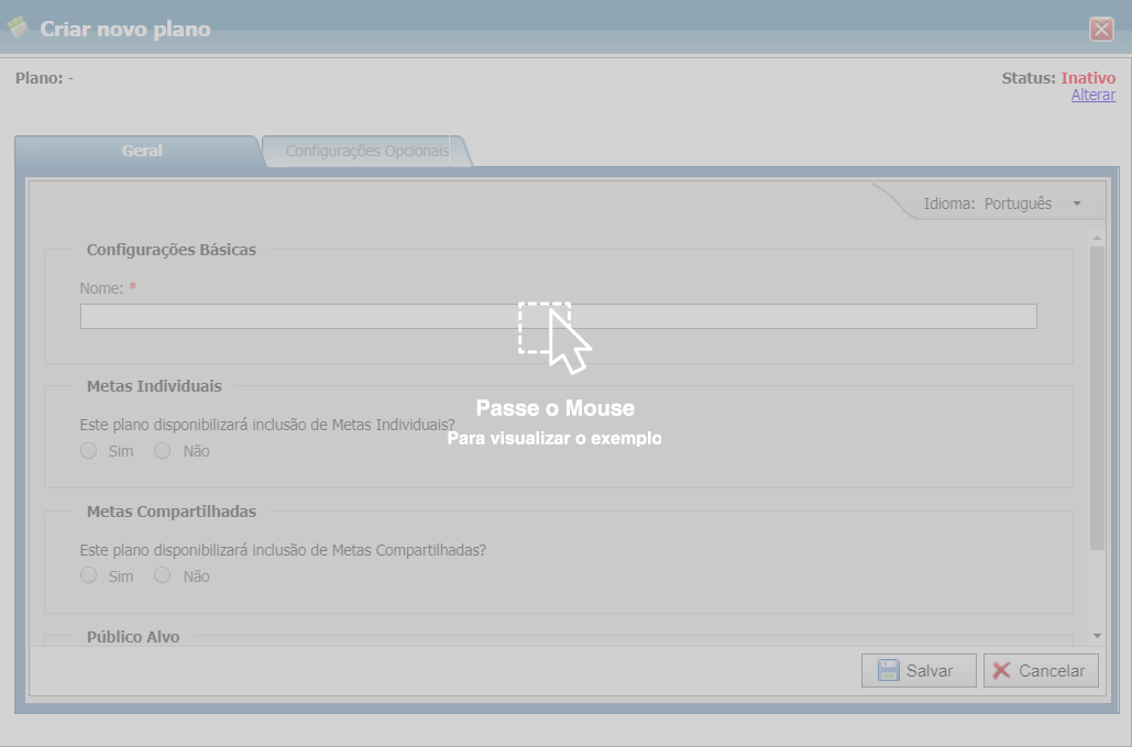 Na janela inclua um Nome, indique se o plano disponibilizará a inclusão de Metas Individuais e indique o mínimo, o máximo e o peso do plano caso a opção de metas individuais esteja habilitada como sim.