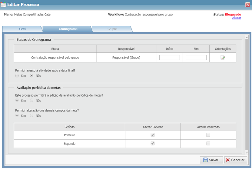 Na guia Cronograma, informe a Data Início e Data Fim, indique se há permissão de acesso após a data fim e se o processo permitirá a edição da avaliação periódica, por fim informe se será permitido a edição dos demais campos da Meta.