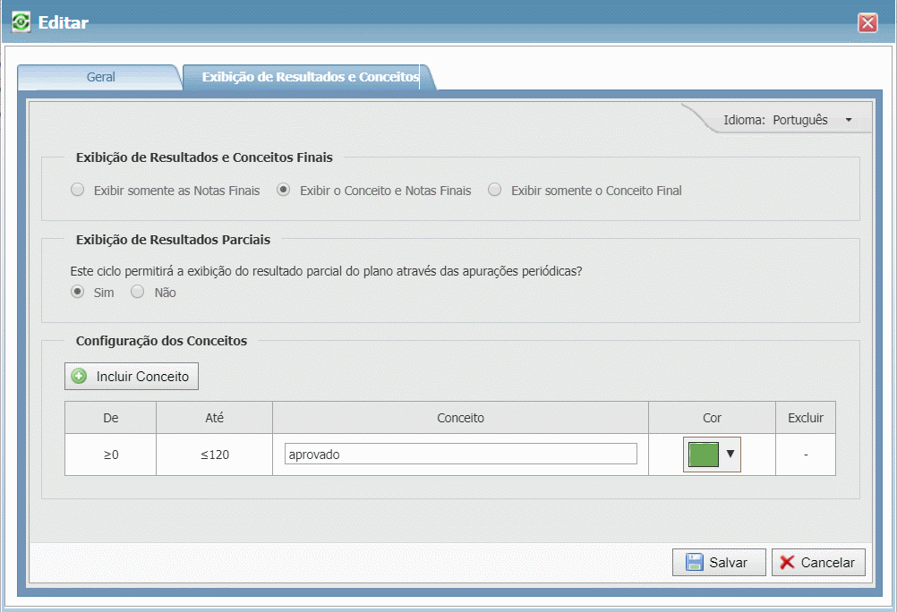 Através do campo Exibição de Resultados e Conceitos, é definido quais serão as formas de visualização para as definições caracterizadas nas Configurações dos Conceitos.