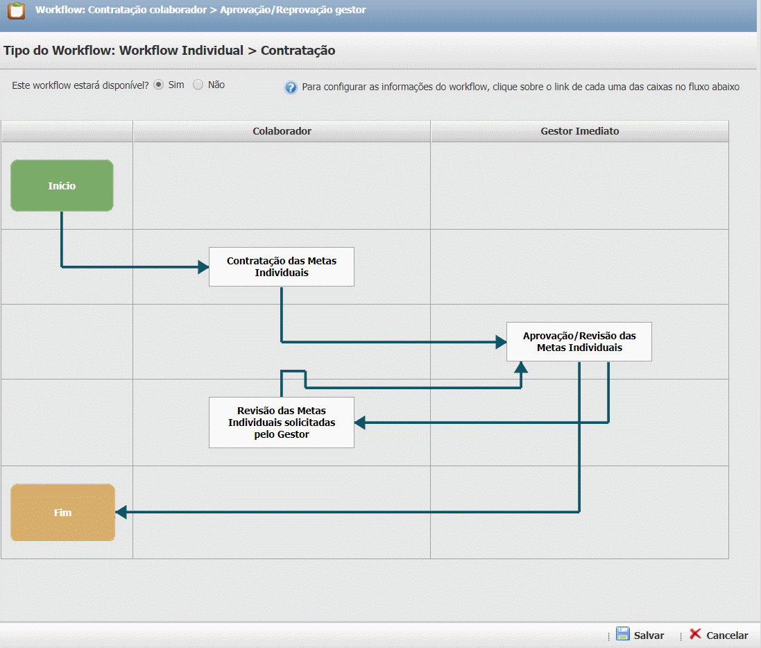 A funcionalidade Workflow, permite realizar configurações das atividades de Contratação, Revisão e Avaliação de workflows Individuais e de Grupos.