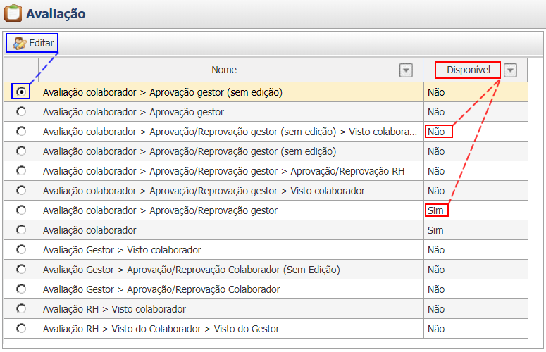 A tela da funcionalidade exibe informações da situação do Workflow para com o módulo através da coluna Disponível, exibindo Não na coluna para informar que as configurações não serão aplicadas no módulo, e quando apresenta Sim na coluna, o contrário ocorre.