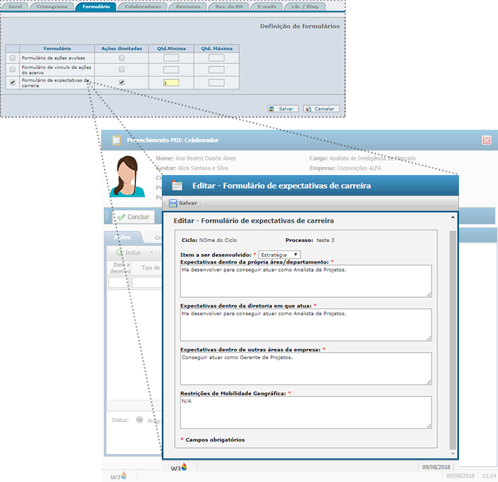 Formulário expectativa de carreiras - quando optado por este formulário, no portal do colaborador, será disponibilizada uma tela para que o colaborador possa incluir as informações necessárias sobre suas expectativas de desenvolvimento em uma determinada carreira.