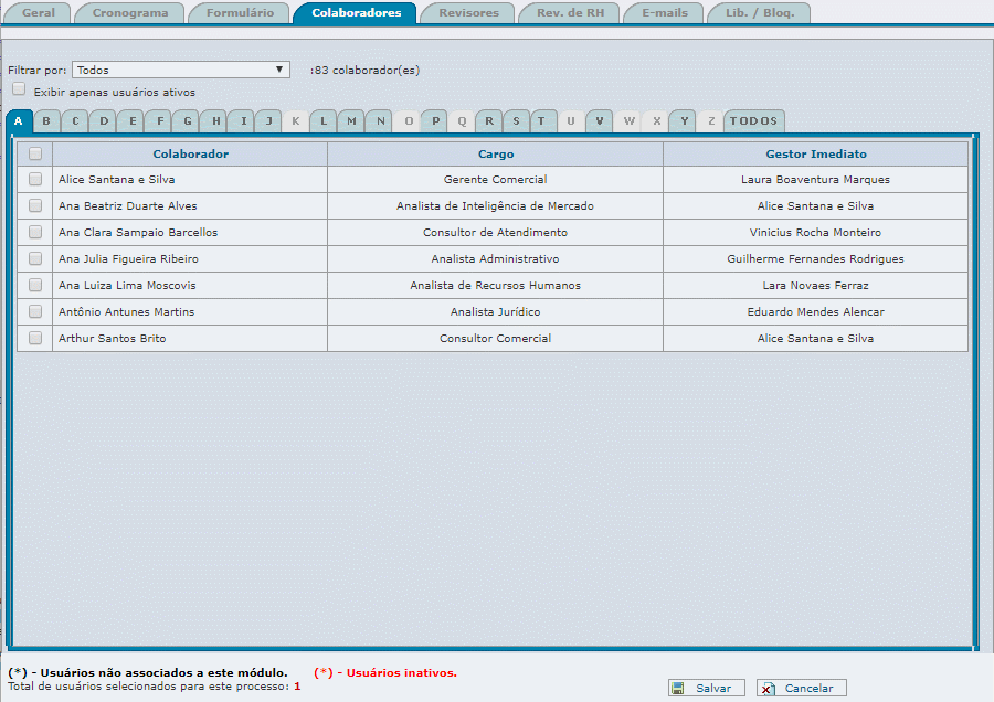 Para facilitar ainda mais a busca, na lista é possível selecionar os colaboradores através das iniciais do seu nome, para isso basta clicar na guia da letra correspondente.