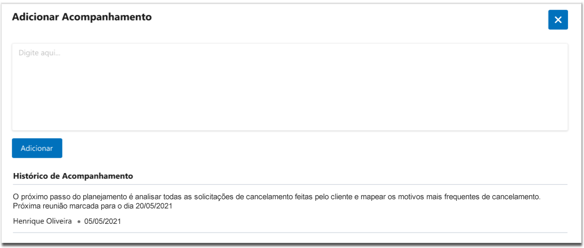 onde o colaborador pode inserir comentários a respeito do andamento da meta. Todos os Acompanhamentos serão identificados