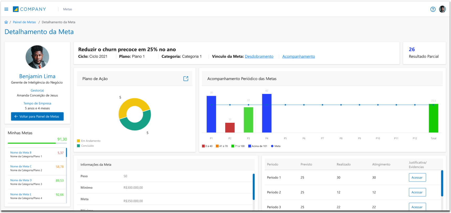 No lado esquerdo da página são exibidas as informações do usuário logado, como: Nome, Cargo, Gestor Imediato e Tempo de Empresa. Caso deseje regressar ao Painel de Metas do colaborador clique no botão Voltar para Painel de Metas.