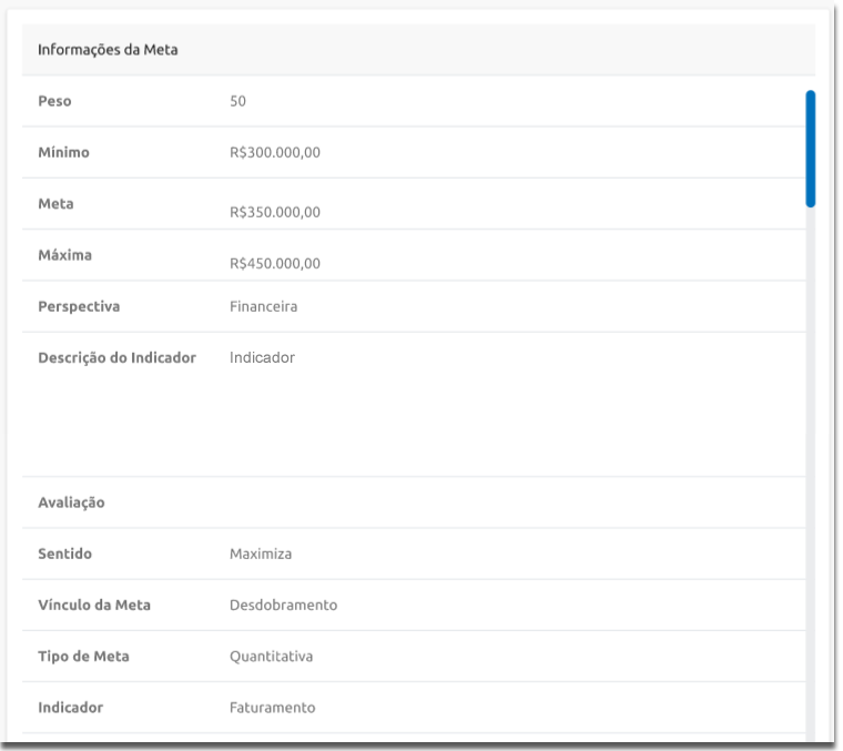 A funcionalidade Detalhamento da Meta é responsável por apresentar todas as informações acerca de uma meta do usuário logado. Essa tela é acessada a partir da funcionalidade Painel de Metas quando quando o usuário, ou seu gestor direto, clica sobre o nome da meta.