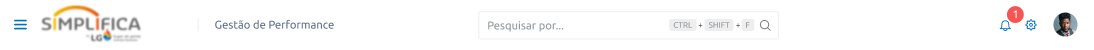 A barra de Topo é dividida em: Menu, Logotipo, Nome do Produto, Caixa de Pesquisa, ícone de Notificação, ícone de Configuração, Botão Help e Foto do Usuário.