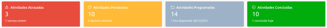 Atividades Atrasadas: exibe a quantidade de atividades atrasadas, quantas atividades venceram e o número de dias.