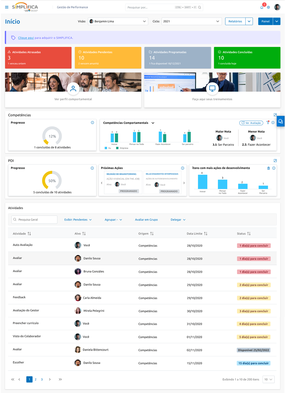 Também são apresentadas as informações de Origem e de Data Limite que aparecem de forma crescente na seção Minhas Atividades.