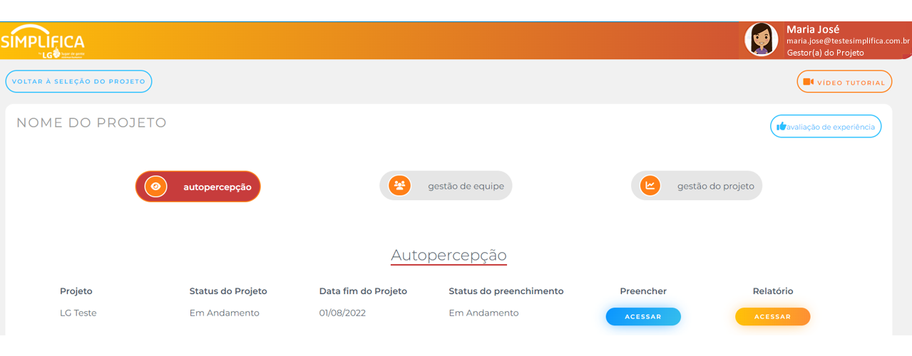 Após isso, será apresentada a tela do projeto, essa tela terá três tipos de visão, sendo, a visão do colaborador que poderá acessar somente a Autopercepção, do gestor com acessos a Autopercepção e Gestão de Equipe e a visão do gestor do projeto que poderá acessar a Autopercepção, Gestão de Equipe e Gestão do Projeto.