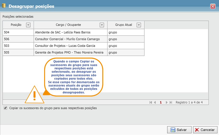 Para remover posições de um grupo selecione as posições desejadas e clique em