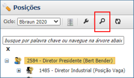 Caso deseje realizar uma busca por qualquer palavra exibida na hierarquia de posições (nome da posição, número da posição, nome do ocupante), basta clicar na lupa em seguida informe a descrição da pesquisa.