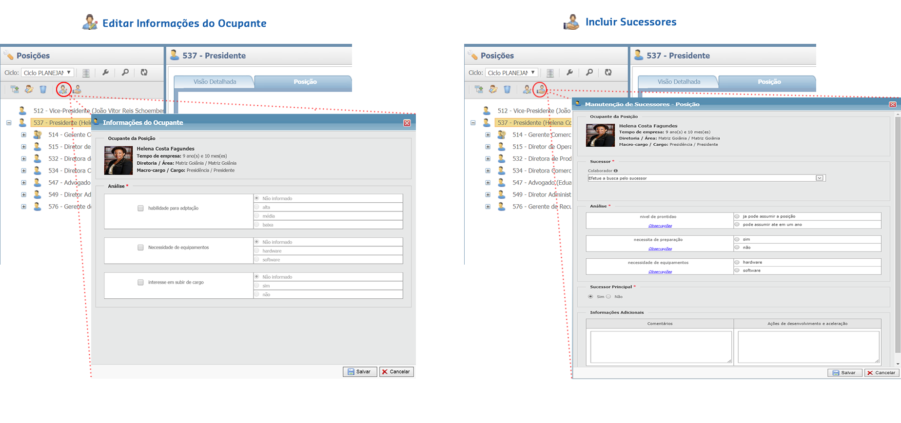 Posições, é um conceito que permite avaliar riscos presentes na posição e também considerar e avaliar ocupantes/sucessores para estas posições. Através desta funcionalidade é possível incluir posições, assim como, editar e excluir posições já existentes.