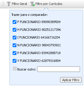 Filtro por Currículos - Permite pesquisar por um colaborador específico. Caso o usuário faça um filtro no Filtro Geral, o Filtro por Currículos exibe a lista dos colaboradores filtrados pelo filtro geral.