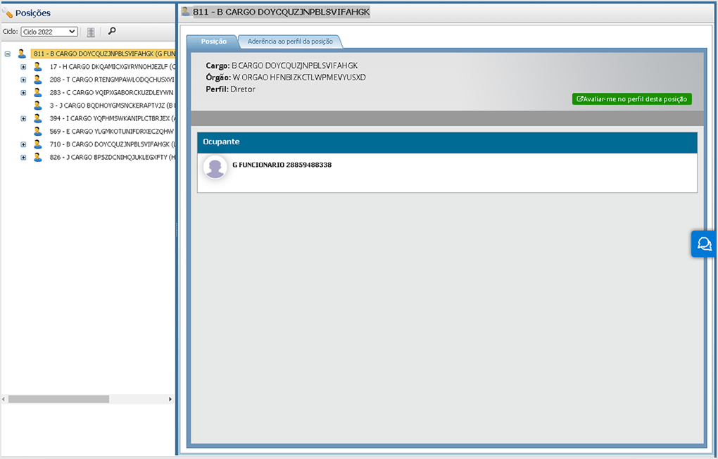 Para uma avaliação rápida da posição do ocupante, são apresentadas as seguintes informações sobre a posição: Cargo, Órgão e Perfil cadastrado para a posição selecionada. O Perfil será exibido somente quando a posição possuir um perfil associado.