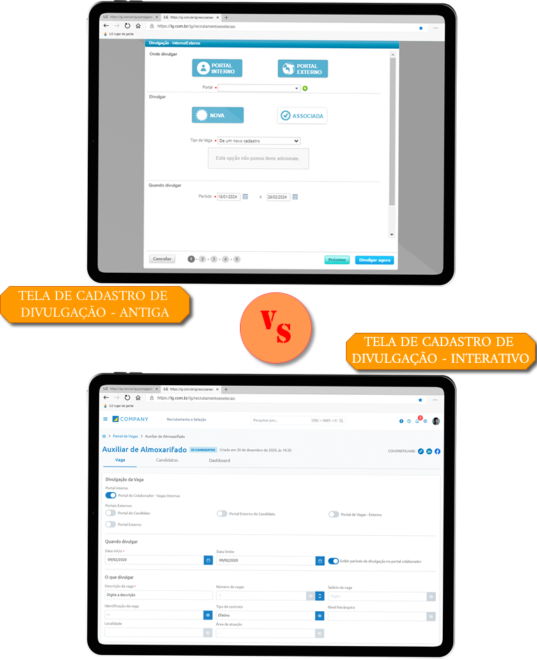 A divulgação da vaga evoluiu, centralizando informações de diferentes portais. Isso facilita o acesso e identificação das oportunidades, permitindo uma rápida distinção entre divulgações externas e internas, além de indicar se estão ativas ou encerradas.